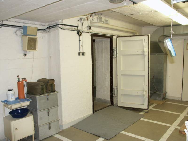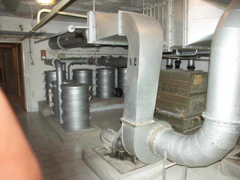 Filtroventilační zařízení Použité zařízení umožňuje dodat za hodinu 3.000 litrů upraveného vzduchu, z toho 2.000 litrů venkovního a 1.000 litrů cirkulačního. Vzduch nasávaný z venkovního prostoru je veden přes vyrovnávací tlakovou jímku naplněnou křemennými valouny na hrubé filtry (tři ks) a dále na dva jemné filtry. Poté je rozváděn do celého prostoru krytu. V případě izolace prostoru jsou venkovní nasávací jímky uzavřeny a vzduch odsávaný z prostor krytu se zbavuje CO 2 na filtrech s náplní natronového vápna a po průchodu jemnými filtry je obohacován čistým kyslíkem, předávaným z tlakových lahví. Zařízení může pracovat minimálně 26 hodin.