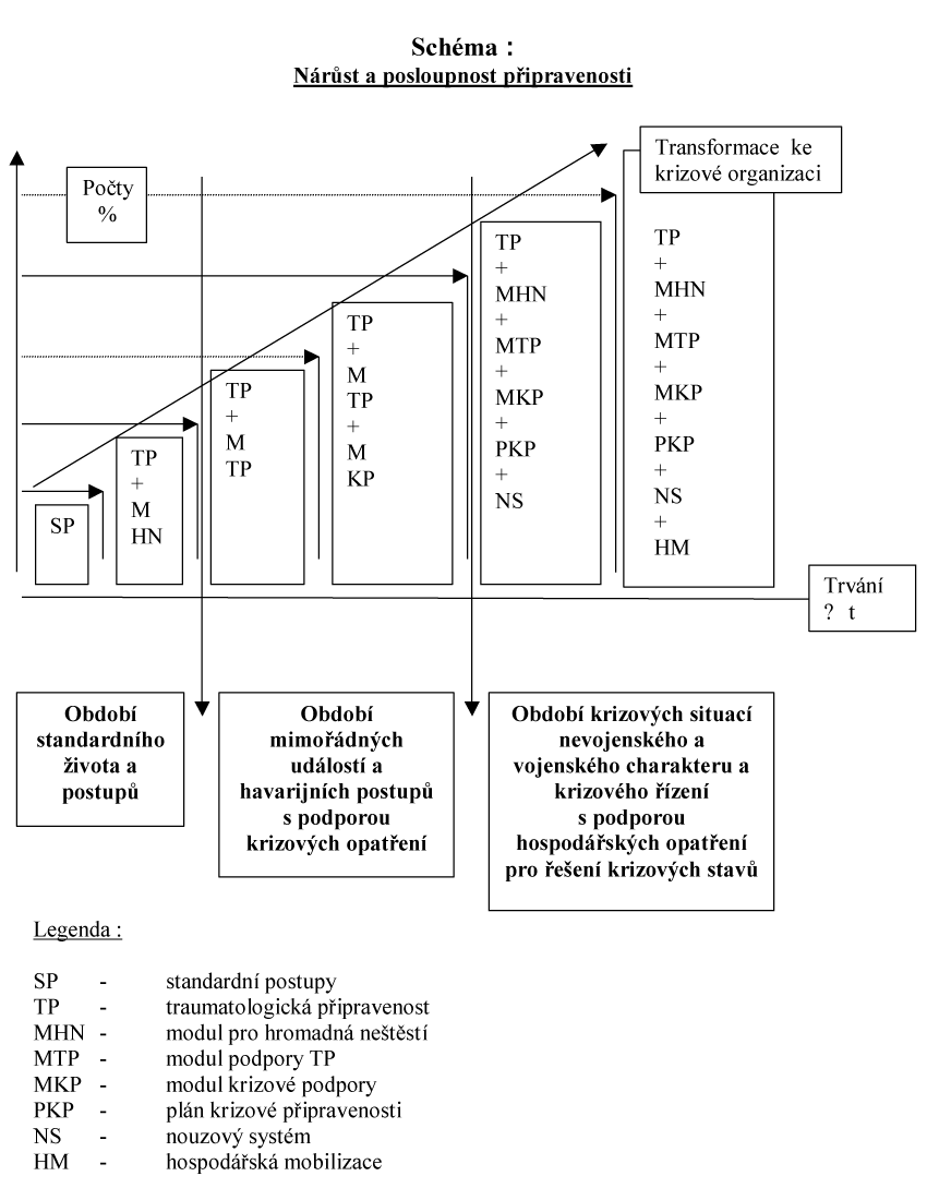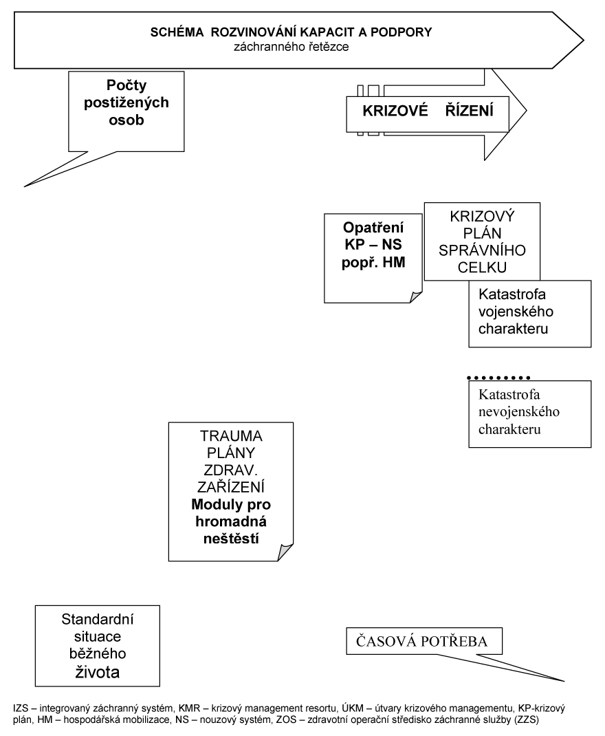 K tomu rezort využívá svou krizovou infrastrukturu. V podmínkách zdravotnické záchranné služby tzn. krizová organizace zdravotnické záchranné služby vznikající restrukturalizací ZZS a aktivací krizového štábu ZZS se svým sekretariátem = krizový útvar zdravotnické záchranné služby a MODUL KRIZOVÉ PODPORY (ten doplňuje MODUL PRO HROMADNÁ NEŠTĚSTÍ a MODUL PODPORY TRAUMAPLÁNU základním vybavením možných pracovišť potřebným materiálem a prostředky zdravotní péče). Modulové uspořádání podpory umožňuje poměrně rychlé vybudování náhradních míst pro poskytování zdravotní péče (za zničené nebo vzdálené či jinak nedostupné zdravotnické zařízení) v místě potřeby; a to za využití pevných objektů či poškozených objektů zdravotnických zařízení, nebo náhradních objektů - stan, přístřešek; k poskytování lékařské první pomoci a zabránění prohlubování poruch zdraví směrem k těžkému tělesnému nebo psychickému poškození. A to až do doby náběhu systému zdravotní péče prostřednictvím nouzového systému (zákon č. 241/2000 Sb., o hospodářských opatřeních pro krizové stavy – poskytování nezbytné zdravotní péče, zásobování léky, materiálem a prostředky). I za těchto podmínek však bude zdravotnická záchranná služba poskytovat přednemocniční neodkladnou péči podle zásad přednemocniční neodkladné péče a transportovat postižené do cílových zařízení – náhradních krajských nebo rezortních – v závislosti na charakteru postižení, ale ve ztížených podmínkách krizové situace. V této situaci bude rozhodující vnitrokrajská a mezikrajská koordinace, vzájemná podpora jednotlivých poskytovatelů v liniovém pojetí podle druhu a rozsahu poskytované zdravotními pojišťovnami, reorganizace zdravotnických služeb kraje a rezortní podpora, buď přímo řízenými organizacemi Ministerstva zdravotnictví ČR nebo rezortními kapacitami strategických zásob či mezinárodní pomocí v rozsahu záchranné a humanitární operace v režimu zahraniční výpomoci. Pro jednotlivé typy možných krizových situací (vždy v souladu s platnou Bezpečnostní strategií České republiky) se bude zdravotní péče (rozsah, úroveň, kvalita a dostupnost) regulovat Ministerstvem zdravotnictví ČR prostřednictvím Ústředního krizového štábu, vlády, popř. typovými plány rezortu (standardy pro krizové situace).