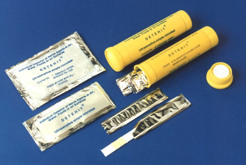 Ochrana před nervově paralytickými látkamiPrincipy ochrany před zpuchýřujícími látkami platí v plné míře pro ochranu před nervově paralytickými látkami. Vzhledem k vysoké toxicitě nervově paralytických látek je potřeba některé skutečnosti zdůraznit. I v případě nervově paralytických látek poskytují dokonalou ochranu dýchacích cest shora uvedené ochranné masky vojskového typu a civilní ochranné masky. Vzhledem k vysoké toxicitě je v daném případě kladen mimořádný důraz na bezchybný funkční stav všech součástí, správné nasazení a utěsnění ve všech těsnicích liniích (mezi lícnicí a obličejem, ve spojení filtru s lícnicí, stav vydechovacích ventilů) k zamezení i minimálního podsávání. Klíčovou podmínkou je možnost rychlého použití, protože při bojových koncentracích může i několik vdechů, v krajním případě i jeden vdech vyvolat symptomy intoxikace, vedoucí až k zneschopnění. Zejména v případě nervově paralytických látek je potřeba zdůraznit možnost sekundární intoxikace parami látky, která se může odpařit z povrchu ochranné výstroje i běžného oděvu po sejmutí ochranné masky. Proto nepřítomnost nervově paralytických látek v ovzduší i po delší době od chemického napadení nelze chápat jako automatický signál k sejmutí ochranné masky v případě, kdy zejména těkavější látky (sarin, soman) mohly být sorbovány v povrchových vrstvách výstroje. Při možném zasažení nervově paralytickými látkami je naprosto nezbytné zabránit jejich kontaktu s nechráněným povrchem těla. Dokonalou ochranu, i po dobu několika hodin, poskytují všechny standardní vojskové ochranné oděvy i ochranné oděvy civilní ochrany všech zavedených typů. Dobrou ochranu po dobu desítek minut poskytují standardní vojskové jednorázové pláštěnky. Protože civilní obyvatelstvo není vybaveno standardními jednorázovými pláštěnkami, ochranu prakticky stejné úrovně mohou poskytnout shora popsané improvizované prostředky. Jistou krátkodobou ochranu před průnikem látek na kůži poskytují dokonce jakékoliv textilní bariéry, protože chrání povrch těla před bezprostředním kontaktem. Detekce nervově paralytických látekK nejjednodušším prostředkům detekce v našich podmínkách i pro organofosforové nervově paralytické látky patří průkazníkové papírky CALID – 3, které indikují v průběhu asi půl minuty změnou zbarvení drobné kapky. Další jednoduché prostředky jsou založeny na modelové reakci, probíhající v zasaženém organizmu, tj. inhibici butyrylcholinesterázy, kde je jako substrát použit butyrylthiocholinjodid. Míra (resp. rychlost) inhibice enzymatické reakce substrátu je projevem inhibiční účinnosti (toxicity) a koncentrace přítomné nervově paralytické látky. Pro jednoduché prostředky se běžně používá barevné reakce indikátoru pH, jímž se sleduje kyselina uvolněná při enzymatické hydrolýze substrátu nebo se podle barevné změny speciálního chromogenu detekuje uvolněný thiocholin. V našich moderních prostředcích jednoduchého typu, tj. průkazníkových páskách DETEHIT (17) Jednoduché miniaturizované přístroje, umožňující kontinuální monitorování ovzduší i bodovou detekci byly vyvinuty s hlavním určením pro detekci nervově paralytických látek. Jejich mez důkazu je sice poněkud vyšší než u prostředků, založených na enzymatické inhibici (pohybuje se pro jednotlivé typy OL v rozmezí 0,01 – 1 mg.m-3, zato jejich odezva je rychlá.